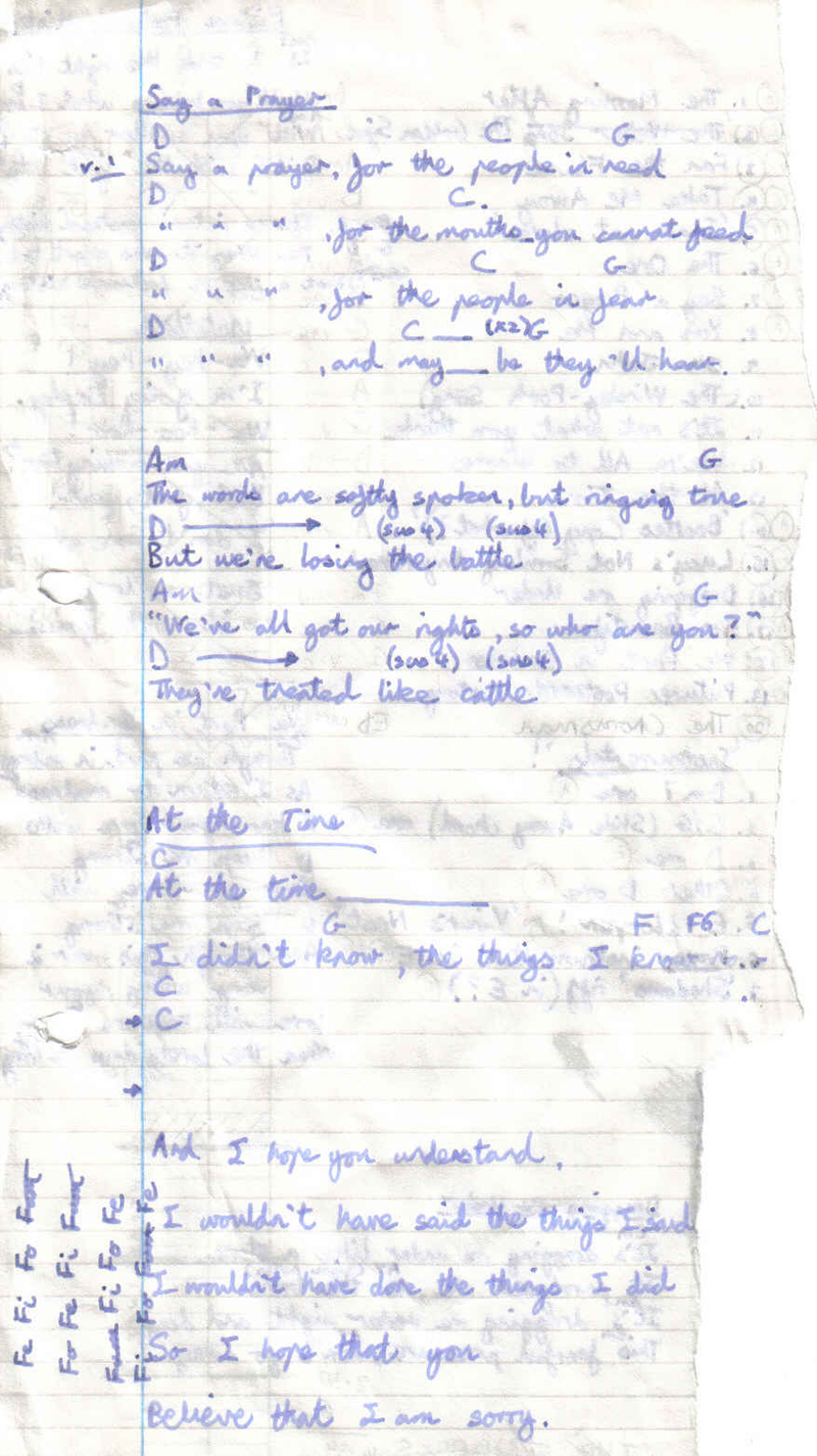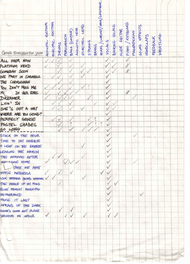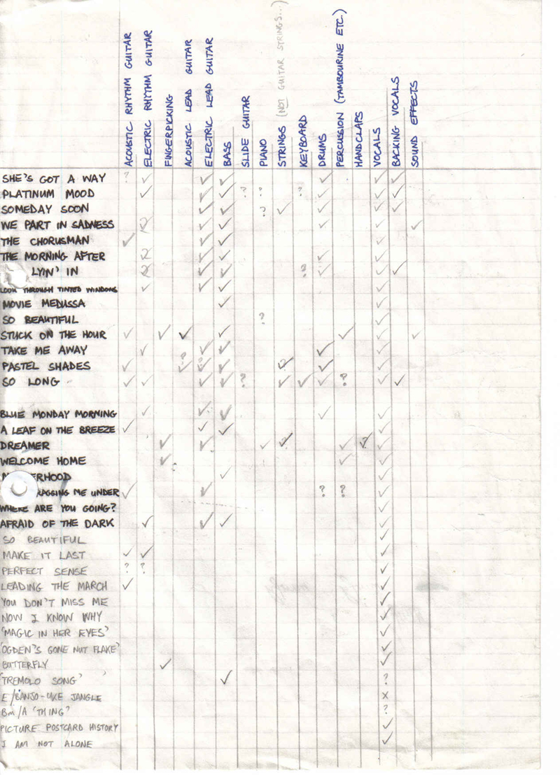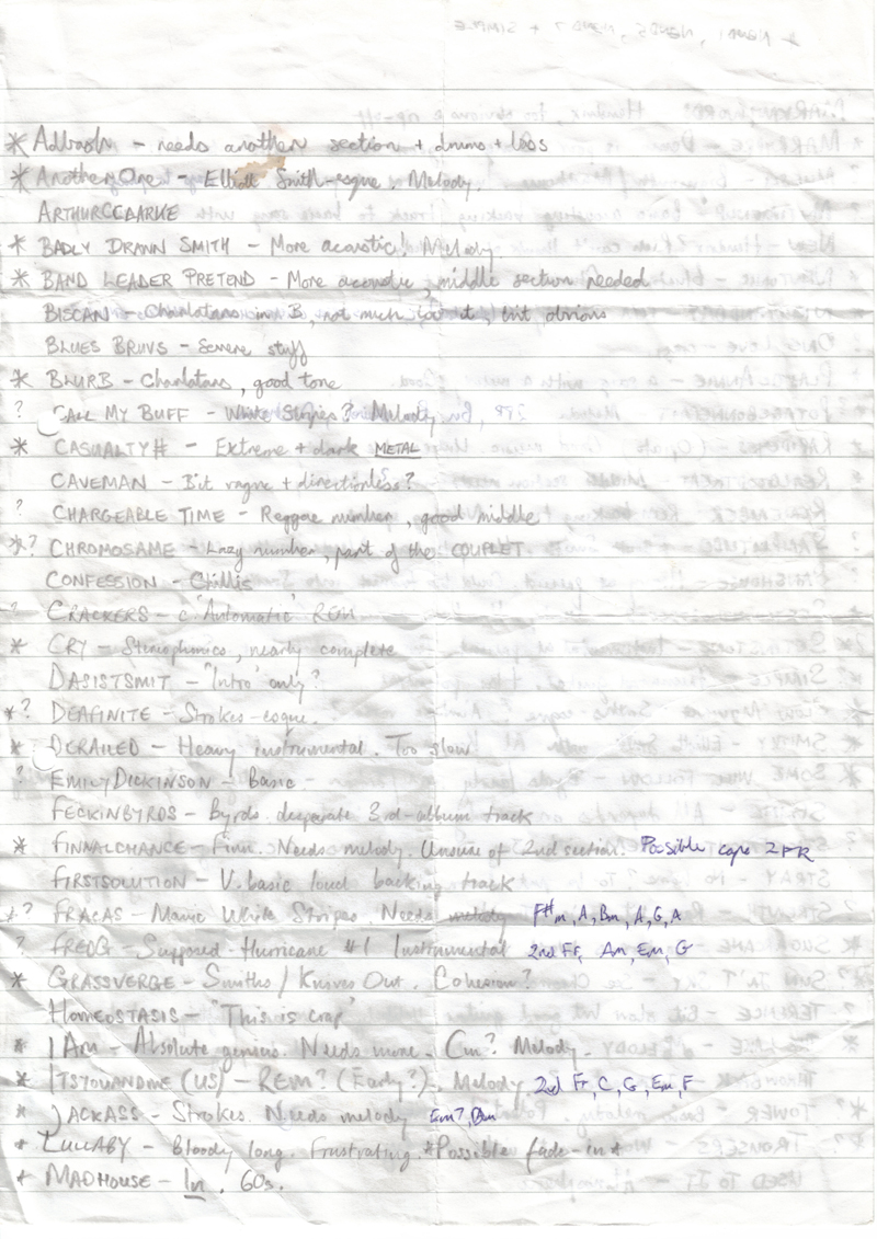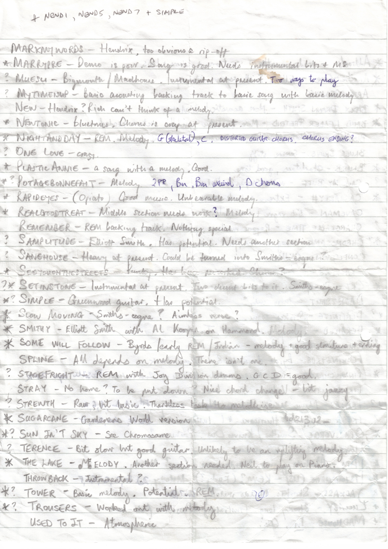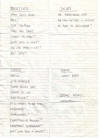 ![]() Detailed handwritten notes from a period of intense creativity when the Ruddles found that their backlog of songs far outweighed the number that they had the skill and musical competence to "record properly". They set about classifying the songs prior to finally recording a definitive double album of the material. This classification exercise has taken 6 years and 7 months at the time of writing. The results are eagerly anticipated ... not least by the band themselves.
