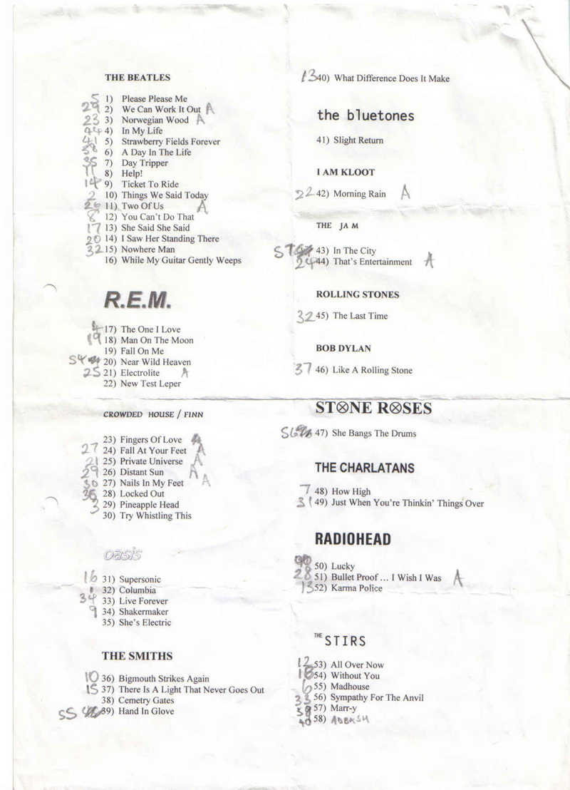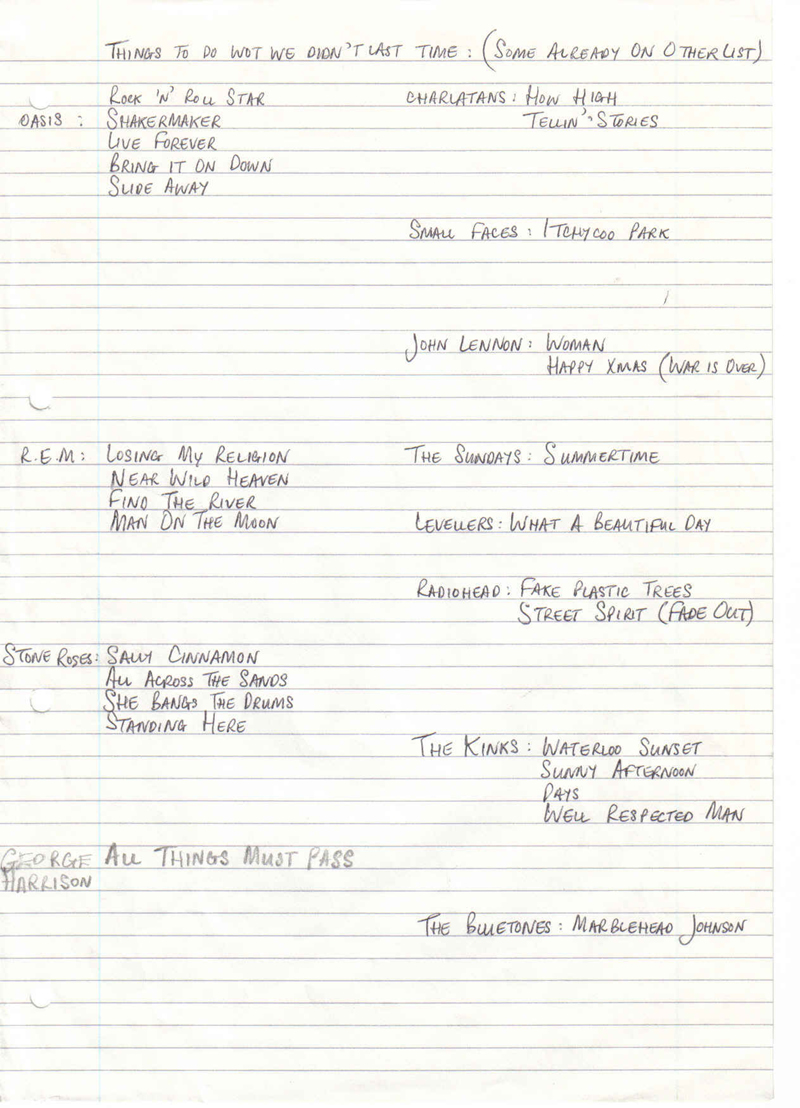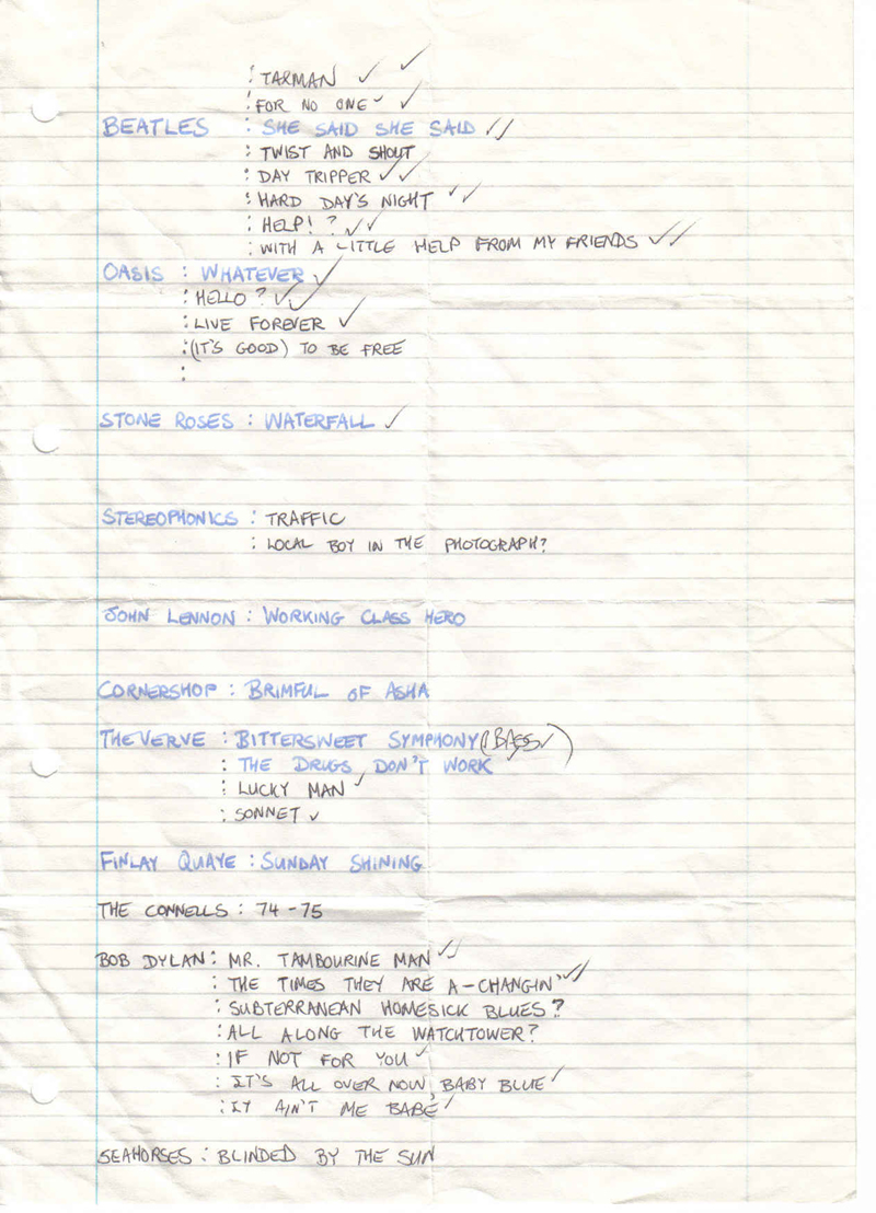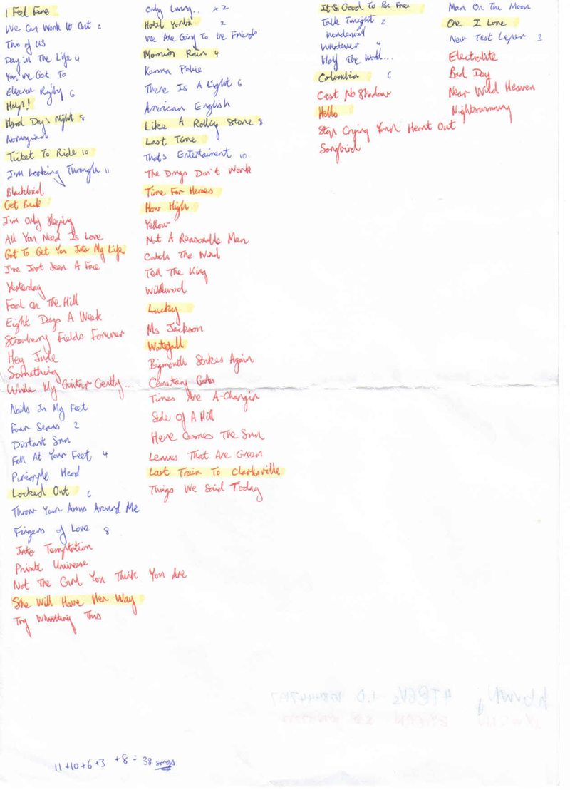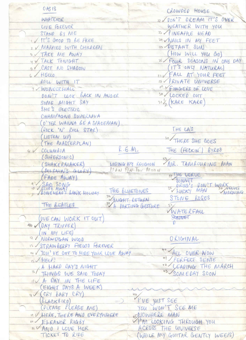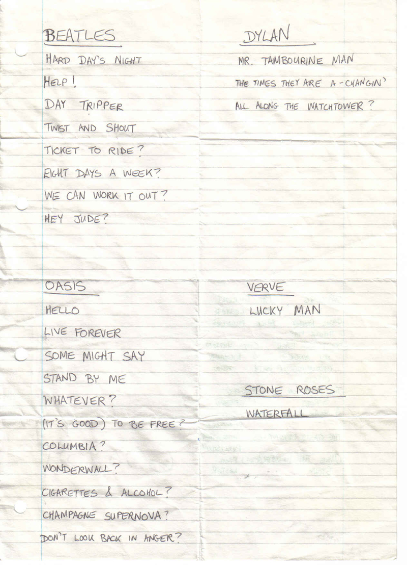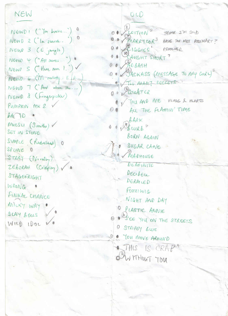![]() The Abbey Road sessions - exclusive set list Note the puncture mark in the centre - caused when one of the band smashed the setlist through a cymbal support in frustration. |